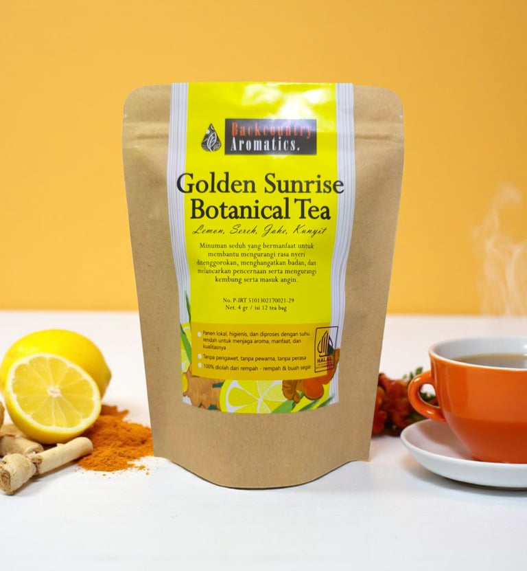 Bangun hari dengan kesegaran alami dan kehangatan rempah pilihan dari alam Sumatera Barat.Golden Sunrise adalah racikan teh botani yang menyatukan lemon yang menyegarkan, sereh yang harum, jahe yang menghangatkan, dan kunyit yang menutrisi dari dalam.